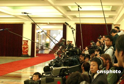四月二十九日下午,中共中央總書記胡錦濤在北京會見中國國民黨主席連戰(zhàn)。大批海內(nèi)外媒體記者云集人民大會堂見證這一歷史時刻。作者:廖文靜