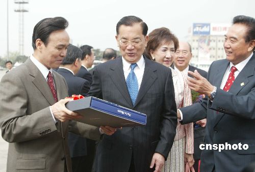 四月三十日,中國(guó)國(guó)民黨主席連戰(zhàn)結(jié)束北京之行啟程前往西安,中共中央臺(tái)辦主任陳云林、北京市委副書(shū)記龍新民在機(jī)場(chǎng)為其送行。圖為連戰(zhàn)獲贈(zèng)北京之行紀(jì)念像冊(cè)分外驚喜。作者:廖文靜
