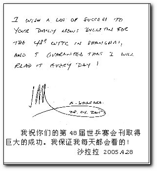 “兩周前當(dāng)我來(lái)到上海,我所看到的一切告訴我,上海為這屆世乒賽作了充分的準(zhǔn)備。三天前我再次走下飛機(jī),一路上到處是彩旗、海報(bào)、宣傳廣告,我看到了布置一新的主、副場(chǎng)館,感受到親切的接待服務(wù)。我還聽(tīng)說(shuō)人們熱情高漲,幾乎所有的球票都賣完了。這使我更加確信,上海已經(jīng)完全準(zhǔn)備好了!眹(guó)際乒聯(lián)主席沙拉拉昨天在接受本報(bào)記者專訪時(shí),再一次對(duì)上海的世乒賽組織工作豎起大拇指。