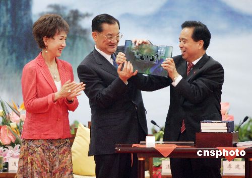 中共陜西省委書(shū)記李建國(guó)四月三十日晚在西安會(huì)見(jiàn)并宴請(qǐng)中國(guó)國(guó)民黨主席連戰(zhàn)和他率領(lǐng)的大陸訪問(wèn)團(tuán)成員。圖為連戰(zhàn)向李建國(guó)回贈(zèng)禮物。作者:毛建軍