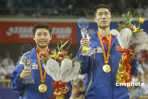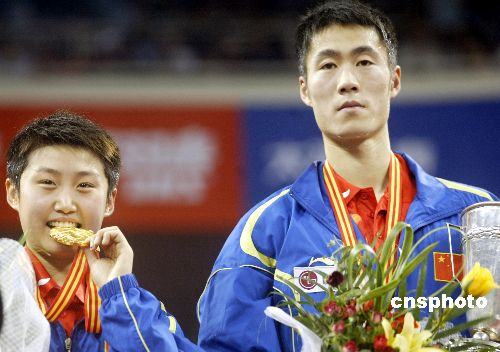 中新社上海五月四日電 (記者 王歡)昨天被中國隊(duì)提前簽收的混合雙打金牌,今天正式歸于王勵(lì)勤/郭躍名下,兩人以四比三戰(zhàn)勝隊(duì)友劉國正/白楊獲得了本屆世乒賽上的第一枚金牌。