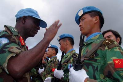中新網(wǎng)5月6日電 據(jù)外交部網(wǎng)站消息,5月5日,中國人民解放軍第二批駐利比里亞維和部隊(duì)授勛儀式在利首都蒙羅維亞隆重舉行,聯(lián)合國利比里亞特派團(tuán)(簡稱聯(lián)利團(tuán))代理行政長官穆薩大使、武裝部隊(duì)總司令?yuàn)W瓦尼比中將和副總司令塔希爾少將、行政總監(jiān)斯托克斯等聯(lián)利團(tuán)高級官員,中國駐利大使林松添等使館主要外交官,各國駐利維和部隊(duì)司令、軍事和民事觀察員及民事警察代表等近500人出席儀式。中國維和部隊(duì)領(lǐng)隊(duì)唐倫興上校、林松添大使和穆薩大使分別致辭。穆薩大使代表聯(lián)利團(tuán)檢閱了中國維和部隊(duì)儀仗隊(duì),并同聯(lián)利團(tuán)主要官員向中國維和官兵頒發(fā)聯(lián)合國維和勛章。
