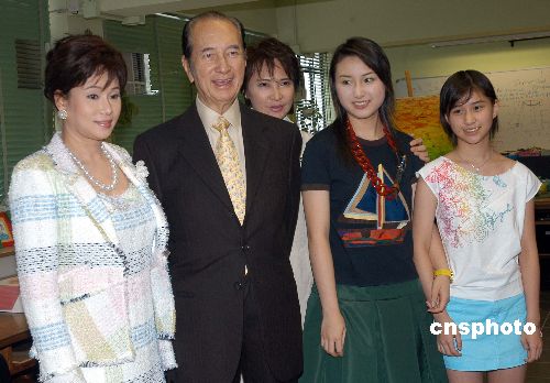 5月11日,港澳知名人仕何鴻燊博士與其三太何陳婉珍及兩名女兒在香港出席護苗基金會《護苗初中教育課程》首映會,護苗基金會會長蕭芳芳(中)并與何鴻燊一家四口合照。作者:鄧慶樂
