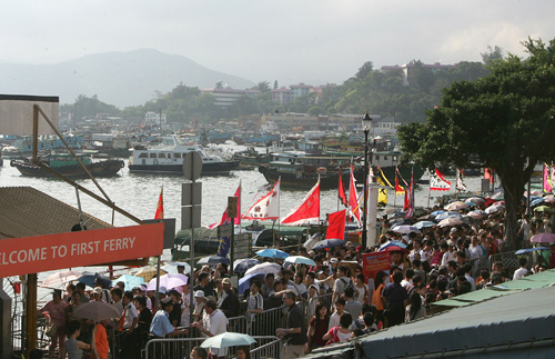 中新網(wǎng)5月16日電 據(jù)香港大公報報道,一年一度的香港長洲太平清醮會景飄色巡游昨日舉行,由于停辦了二十六年的“搶包山”活動今年復辦,令原來已很熱鬧的小島變得更熱鬧。今次飄色巡游有十多隊參加,每隊都有不同主題。據(jù)估計,活動吸引超過二萬人參與,其中由兩名小朋友扮演的曾蔭權和董建華最神似。