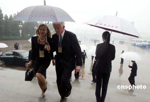 五月十六日晚,二○○五北京《財(cái)富》全球論壇在北京人民大會(huì)堂開幕。圖為參加開幕式的嘉賓冒雨抵達(dá)人民大會(huì)堂。作者:廖文靜