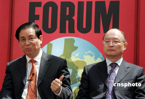 2005北京《財(cái)富》全球論壇5月18日專門舉行“中國(guó)銀行業(yè)改革近況”會(huì)議,中國(guó)銀監(jiān)會(huì)主席劉明康(左)、國(guó)家開(kāi)發(fā)銀行行長(zhǎng)陳元用嫻熟的英語(yǔ)坦誠(chéng)地與世界各國(guó)業(yè)界人士對(duì)話。作者:任晨鳴