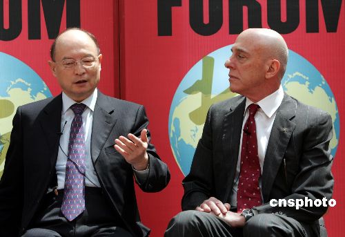 2005北京《財富》全球論壇5月18日專門舉行“中國銀行業(yè)改革近況”會議,中國國家開發(fā)銀行行長陳元(左)與會,并回答安永會計師事務(wù)所合伙人羅德曼等人提出的有關(guān)中國銀行業(yè)治理腐敗、貪污等方面的問題。作者:任晨鳴