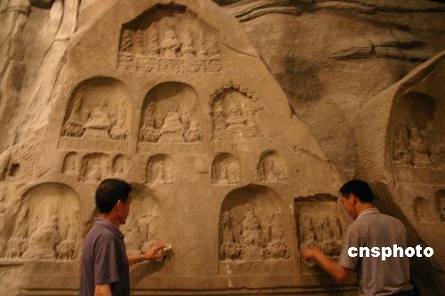| 五月十八日,重慶中國(guó)三峽博物館正在為開館緊張準(zhǔn)備。兩名工匠正清潔“龍灘河摩崖造像”!褒垶┖幽ρ略煜瘛笔侨龒{博物館內(nèi)最“重量級(jí)”的文物,其重量超過(guò)三十噸,由兩塊整體切割的造像巖石組成。三峽蓄水達(dá)到一百三十五米時(shí),“龍灘河摩崖造像”就被淹沒(méi),早前當(dāng)?shù)匚奈锊块T用了近兩個(gè)月時(shí)間,將造像完整切割。重慶中國(guó)三峽博物館于二○○二年十月二十八日開工,將于今年六月十八日正式開館,預(yù)計(jì)將展出文物八千到一萬(wàn)件,可入藏三十萬(wàn)件文物,主要收藏重慶及三峽地區(qū)文物。作者:郭晉嘉