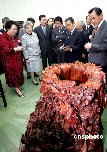 | 五月十九日,二零零五年日本愛知世屆博覽會中國館日活動隆重舉行。中國國務院副總理吳儀(左二)出席,并與日本前首相橋本龍?zhí)?右二)等貴賓一起參觀中國館內(nèi)的紫檀齋。二零零五年日本愛知世博會中國館主題為“自然、城市、和諧--生活的藝術(shù)”,中國館的展出通過博大精深的中國文化的演繹,表達了中國人“天人合一”的哲學思想。圖為中國紫檀博物館館長陳麗華(左一)向來賓介紹精湛的紫檀工藝品。作者:毛建軍