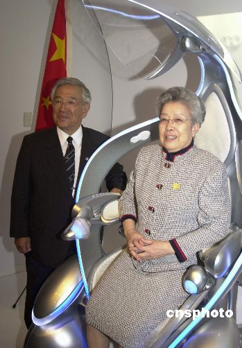 五月十九日,中國副總理吳儀參觀了愛知世博會豐田館。日本世博會協(xié)會會長豐田章一郎向吳儀副總理介紹豐田公司展出的未來型概念車。作者:王健