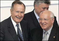 現(xiàn)任美國(guó)總統(tǒng)布什的父親老布什星期一與戈?duì)柊蛦谭蛟谀箍乒餐瑫?huì)見(jiàn)學(xué)生和記者時(shí)說(shuō):“我今天已正式邀請(qǐng)戈?duì)柊蛦谭騾⒓游业南乱淮翁鴤慊顒?dòng)!崩喜际部偨y(tǒng)稱(chēng),戈?duì)柊蛦谭驅(qū)Υ说姆磻?yīng)是“不,不,不”。