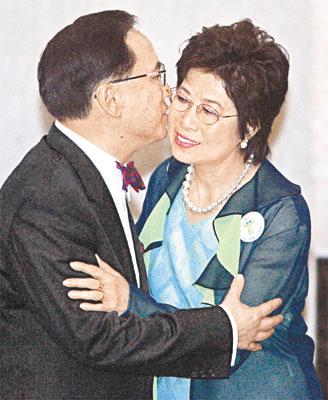 當(dāng)曾蔭權(quán)走下講臺(tái)時(shí),立刻與迎上前去的太太鮑笑薇擁抱。此時(shí),他的競(jìng)選助手們正向媒體散發(fā)內(nèi)涵含講詞和政綱的彩色講義冊(cè),開啟處被設(shè)計(jì)成上方有一藍(lán)色煲呔的淡綠西裝樣式。而冊(cè)子的背后,則是曾太寫有施政理念“強(qiáng)政勵(lì)治,締造和諧,福為民開”的十二字書法,抬首處是一枚篆刻小章“自強(qiáng)不息”。(完)