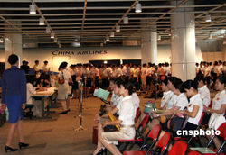 中華航空位于臺(tái)北松山機(jī)場(chǎng)的空服訓(xùn)練部今天一清早就匯聚了眾多白領(lǐng)裝束的應(yīng)聘者,她們大多是應(yīng)屆的大學(xué)生,其中還有八十多名碩士。