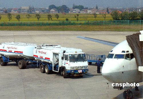 2005年6月3日,據(jù)民航總局披露,中國三大航空公司——國航、東航、南航提出的在機(jī)票中增加燃油附加費(fèi)的申請被有關(guān)部門正式駁回。上月中旬,國航、東航、南航三大航空巨頭共同向國家發(fā)改委申請了征收約占機(jī)票價(jià)格10%的燃油附加費(fèi)。民航總局有關(guān)負(fù)責(zé)人表示,盡管目前燃油價(jià)格居高不下,但由于2004年4月份《民航國內(nèi)航空運(yùn)輸價(jià)格改革方案》中已經(jīng)明文取消了燃油附加費(fèi),因此三大航空公司的申請不被接受。圖為寧波櫟社機(jī)場一輛加油車正在為飛機(jī)加油。作者:張和平