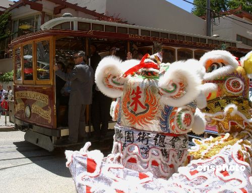 六月三日,在美國舊金山出席聯(lián)合國世界環(huán)境日活動的世界各國市長和嘉賓,到華埠乘坐古老的有軌電車,受到舞獅舞龍的歡迎。作者:賈國榮