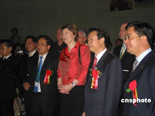 新西蘭總理海蓮·克拉克一行四日上午來到愛知世博會中國館參觀,并興致勃勃地為當天在這里開幕的海南周剪彩。圖為克拉克(右三)在海南省副省長陳成(右二)、中國館館長孫鋼(右四)的陪同下饒有興趣地參觀了當天洋溢著濃郁熱帶風(fēng)情的中國館。作者:王健