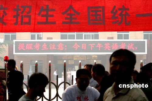 6月8日上午,河南鄭州十一中電子屏滾動字幕上寫有提醒考生注意的相關警示標語,特別引人注目。作者:陳代述