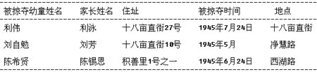 官麗珍根據(jù)在廣州市檔案館查閱的檔案,在書中列舉了檔案中記載的三名中國幼童的姓名、家長姓名、地址、被掠奪時間和地點(詳見左表)。這些兒童都是在廣州市警察局轄內(nèi)被日軍掠走的。官麗珍認為,當年日軍擄掠殘殺兒童是常事,但一次性掠走這么多兒童,比較典型。她同時表示,日軍劫掠兒童雖是在日本投降之前,但很難證明日軍意識到要投降才大肆捕捉,為戰(zhàn)后青壯年補充之用。因為日本天皇不說戰(zhàn)敗,日軍也許還認為自身形勢不錯。
