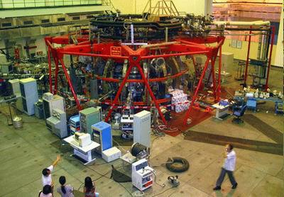 在參觀中,不時可以看到一些研究人員檢查著“人造太陽”的各個部件,還認真記錄下一組組數(shù)據(jù)!斑@個鐵疙瘩究竟如何產(chǎn)生能源呢?”對于我們的疑惑,研究人員解釋道:每1公升海水中就含有0.03克的氘,而這0.03克的氘在“人造太陽”這部裝置中可以產(chǎn)生相當(dāng)于300公升汽油能量的聚變能量,而這個能量是可以轉(zhuǎn)化成電能使用的。