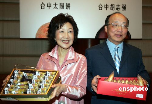 在北京參加2005年世界市長論壇的臺中市長胡志強與夫人,6月9日下午在北京國際飯店舉行“臺中太陽餅、臺中胡志強”專場記者會,不遺余力地向與會大陸各界人士推介臺中特產(chǎn)太陽餅、鳳梨酥。作者:任晨鳴