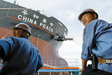2003年6月,“中國航運股份有限公司”向上海外高橋有限公司訂造了兩艘17.5萬噸好望角型散貨船,今天命名交付的“中華和平”號便是其首制船。它比原定日期提前110天完工交船,并將于今天下午啟航向首航目的地、南非理查德灣進發(fā)。