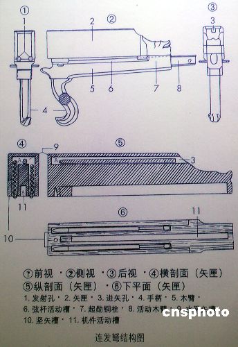 弩機(jī)示意圖。弩機(jī)是具有遠(yuǎn)射和殺傷力較強(qiáng)的武器,它的構(gòu)造分矢匣和機(jī)體兩部分。機(jī)件為銅質(zhì),矢匣用楠木雕制,呈長方形,前端下緣有兩個并列的半圓形發(fā)射孔。匣內(nèi)有三個儲存矢的槽,兩側(cè)為豎槽,可儲矢九枝,中間為水平槽,可并列放置二內(nèi)。?