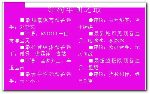 目前報名加入紅粉車團的女星陣容簡直令人“觸目驚心”:容祖兒、黃奕、李心潔、大小S是去年的舊將,而蔡依林、鄭秀文這樣的超級天后加盟,令席位爭奪戰(zhàn)變得異常激烈。另外,更有謝霆鋒母親拉姑、肥肥沈殿霞的加入,讓人懷疑是否要特制跑車,而向來和成龍大哥關(guān)系不錯的韓國美女金喜善也榜上有名,更令爭奪國際化。