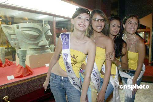 六月十五日,二○○五國(guó)際旅游小姐冠軍總決賽的來自七十五個(gè)國(guó)家和地區(qū)的旅游形象大使,來到四川省廣漢市,參加二○○五中國(guó)四川三星堆國(guó)際旅游文化節(jié)暨二○○五國(guó)際旅游小姐最具魅力小姐冠軍大賽決賽,各國(guó)參賽佳麗在參觀三星堆博物館時(shí),與著名的“三星堆面具”比拼美麗。作者:盛佳鵬
