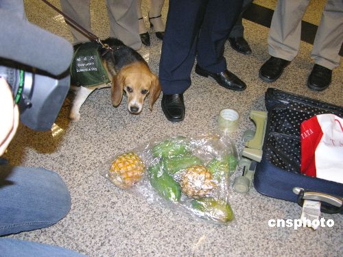 廈門檢驗(yàn)檢疫局六月十五日正式在廈門機(jī)場啟用檢疫犬。圖為檢疫犬“杰瑞”上崗僅十余分鐘即從一位入境旅客攜帶的行李中發(fā)現(xiàn)國家禁止入境的新鮮水果十余個(gè)。作者:黃柏山