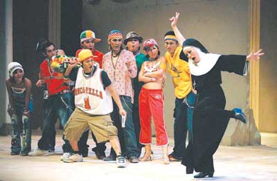 很多人都對黑人女星烏比·戈德堡主演的喜劇電影《修女也瘋狂》記憶猶新,《跑路救天使》即改編自此片。該劇在2004年由臺灣果陀劇場推出,當時曾創(chuàng)下連演31場場場爆滿的記錄,很多場次中謝幕時間竟長達30分鐘。而果陀劇場也是臺灣戲劇界的重要組成部分,它一直致力于“中文歌舞劇”的演出,獲得過多項表演大獎,被業(yè)內(nèi)人士稱為“東方百老匯”。有意思的是該劇中還使用了很多觀眾耳熟能詳?shù)牧餍懈枨,像《讀你》、王菲的《我愿意》、張惠妹的《姐妹》、劉文正的《誰在眨眼睛》等等,而且風格與我們熟悉的曲調(diào)有了很大改變,像《讀你》就被唱出了“圣歌”的味道。