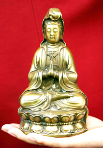 據(jù)收藏這尊佛像的丁先生介紹,這尊古佛像材料采用古銅精密鑄造,佛像高18.3厘米,直徑為10.2厘米,重0.83千克。佛像造型為觀音雙手合十,端坐在蓮花上,端莊而慈祥的面容,整體生動流暢,服飾飛舞飄逸,將觀音的世俗化和個性化以及親和力表現(xiàn)得淋漓盡致。