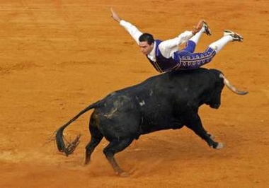 中新網(wǎng)6月21日電 據(jù)路透社報(bào)道,6月19日,在西班牙南部小城阿爾吉西拉斯舉行的斗牛節(jié)上,一名斗牛士正面飛身躍到一頭牛的身上。這種被稱為“recortadores”式的斗牛是古代流傳下來的傳統(tǒng),斗牛士在斗牛的時(shí)候不用斗篷或劍,牛也不會(huì)被殺死。(固山)