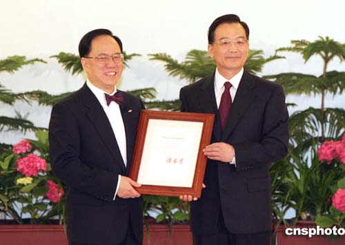 今天的人民大會(huì)堂香港廳懸掛著鮮艷的國(guó)旗和香港特別行政區(qū)區(qū)旗。上午九時(shí),在莊嚴(yán)的國(guó)歌聲中,宣誓就職儀式開始。儀式由國(guó)務(wù)委員、國(guó)務(wù)院秘書長(zhǎng)華建敏主持。他首先宣讀了任命曾蔭權(quán)為香港特別行政區(qū)行政長(zhǎng)官的國(guó)務(wù)院第四百三十七號(hào)令。隨后,曾蔭權(quán)面向溫家寶總理宣誓。宣誓完畢,溫家寶向曾蔭權(quán)頒發(fā)了國(guó)務(wù)院令。