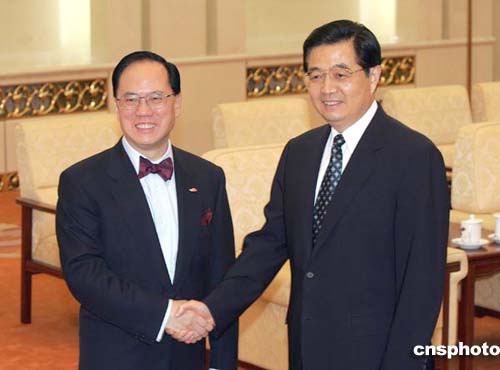 國家主席胡錦濤今天下午在會見香港特別行政區(qū)行政長官曾蔭權(quán)時,希望曾蔭權(quán)先生不負眾望,恪盡職守,奮發(fā)進取,為香港的繁榮穩(wěn)定和發(fā)展作出新貢獻。作者:毛建軍