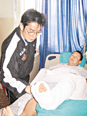 “香港明星足球隊”前日與“中國明星足球隊”于北京進行友誼賽,結(jié)果落敗之余,志偉及張兆輝更受傷收場,志偉被對方隊員踢中左腳,痛得未能站起來,最后要用擔架抬離現(xiàn)場,隨即送院治理,經(jīng)醫(yī)生診斷后需馬上進行手術(shù),幸好一切順利,據(jù)其主診醫(yī)生透露,志偉傷勢并不嚴重,大約休息七天,待完全康復后更可繼續(xù)踢球。
