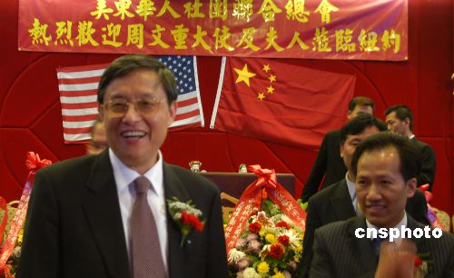 當(dāng)?shù)貢r間六月二十七日,中國駐美大使周文重(左)專程來紐約看望僑胞,受到各界僑胞熱情歡迎。作者:譚宏偉
