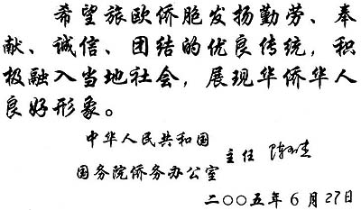 陳玉杰在《歐洲時(shí)報(bào)》題詞向旅歐僑胞致意(圖)