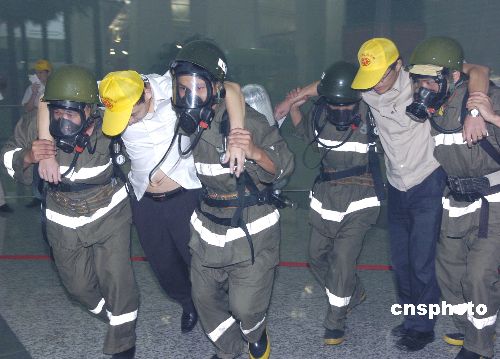 六月二十九日晚十時(shí),廣州新白云國(guó)際機(jī)場(chǎng)首次進(jìn)行火災(zāi)應(yīng)急救援演練,以檢驗(yàn)新機(jī)場(chǎng)的應(yīng)急能力和各單位的配合情況。圖為救援人員到場(chǎng)搶救受傷旅客。作者:羅仰明