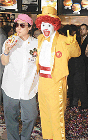 頭戴粉紅色帽子及架著墨鏡的陳奕迅,昨日精神奕奕出席麥當(dāng)勞剪彩儀式,現(xiàn)場除有青春少女跳舞助興外,還有醒獅點(diǎn)睛、切燒豬及祝酒儀式,Eason與麥當(dāng)勞叔叔喜相逢,二人合照留念,場面相當(dāng)熱鬧。