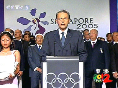 主辦城市選舉的懸念留到了最后一輪,由倫敦“決斗”同樣強(qiáng)大的巴黎。在這輪的投票選舉中,雙方?jīng)]有讓國際奧委會主席羅格難堪的戰(zhàn)成平手,而是高下立分。在經(jīng)過一段讓人幾乎窒息的等待之后,一位華裔新加坡女孩把放有結(jié)果的信交給了羅格。羅格在感謝了東道主新加坡民眾、此前提出申請的國家和五個候選國家后,向世人大聲宣布:國際奧委會決定,把第30屆奧運會的主辦權(quán)交給倫敦!