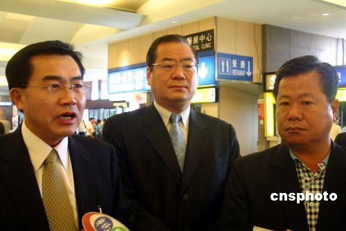 七月七日上午,國(guó)民黨“立委”李全教(左一)與國(guó)民黨中央政策會(huì)執(zhí)行長(zhǎng)曾永權(quán)(中)、親民黨“立委”蔡勝佳(右一)在桃園機(jī)場(chǎng)接受采訪,介紹八日將在北京就臺(tái)灣水果登陸細(xì)節(jié)舉行的協(xié)商會(huì)議。作者:劉舒凌