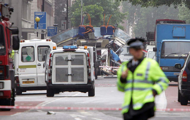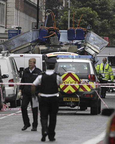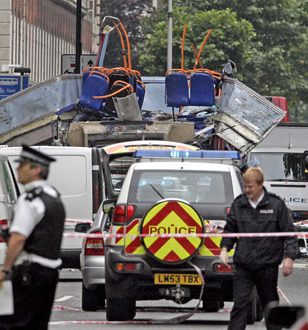 中新網(wǎng)7月7日電 英國警方稱,至少有兩人在今天倫敦公共汽車和地鐵發(fā)生的六起爆炸案中喪生。圖為在地鐵發(fā)生爆炸后在倫敦阿爾德加特東站門前工作的警察和消防隊員。(春風)