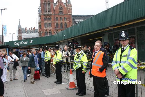 當(dāng)?shù)貢r(shí)間七月九日,在倫敦國(guó)王十字地鐵站前,仍有大批警察戒備。作者:齊彬