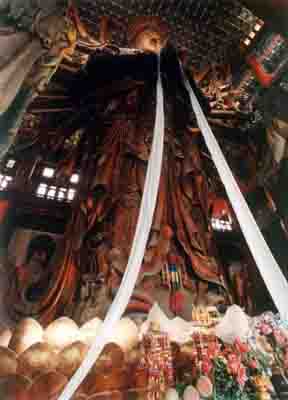 普寧寺讓人記住的另一個原因即是其主殿——大乘之閣陳列的世界最大金漆木雕佛像——千手千眼觀世音菩薩像。佛像高23。511米,腰圍15米,重達110噸,僅頭部就重達5噸,用去松、柏、榆、椴、杉五種木材共120立方米。
