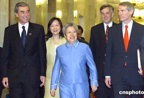 中國國務(wù)院副總理吳儀與美國商務(wù)部長古鐵雷斯進(jìn)行會(huì)談。作者:廖文靜
