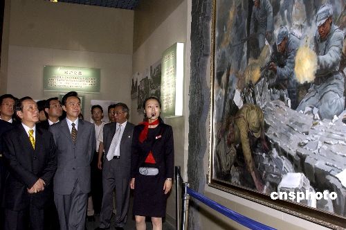 隨后郁慕明一行來到位于宛平城北側(cè)的“中國(guó)人民抗日戰(zhàn)爭(zhēng)紀(jì)念館”。在序廳里,郁慕明向抗日英烈們敬獻(xiàn)了花圈,并默哀致敬。隨后,訪問團(tuán)參觀了“偉大勝利——紀(jì)念中國(guó)人民抗日戰(zhàn)爭(zhēng)暨世界反法西斯戰(zhàn)爭(zhēng)勝利六十周年大型主題展覽”。展覽分民族危急救亡興起、國(guó)共合作共赴國(guó)難、中流砥柱抗戰(zhàn)燈塔等八個(gè)部分。記者注意到,郁慕明在國(guó)共合作共赴國(guó)難以及臺(tái)港澳同胞抗日部分逗留時(shí)間最長(zhǎng)。