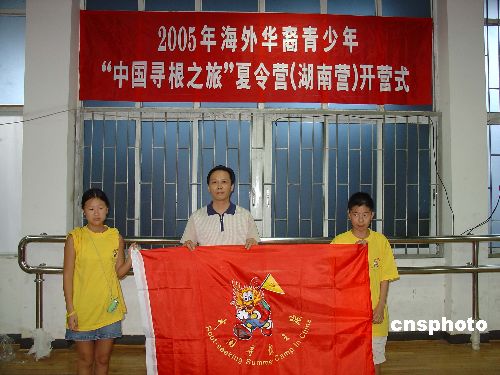 | 7月11日,2005年海外華裔青少年“中國尋根之旅”夏令營(yíng)在長(zhǎng)沙舉行開營(yíng)式。來自美國和丹麥的華裔青少年將在這里進(jìn)行為期9天的學(xué)習(xí)和參觀活動(dòng)。圖為湖南省外僑辦向營(yíng)員代表頒授了《中國尋根之旅夏令營(yíng)》營(yíng)旗。作者:鄧霞
