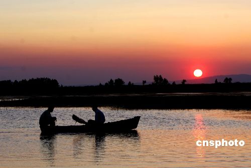 7月10日,新疆哈巴河縣巴依喬拉克濕地落日前漁民撒魚苗時(shí)的情景。哈巴河縣水利資源豐富,近年來,該縣拿出專項(xiàng)資金管護(hù),使全縣各類濕地達(dá)200多萬畝,成了各種鳥類棲息的天堂。作者:金煒