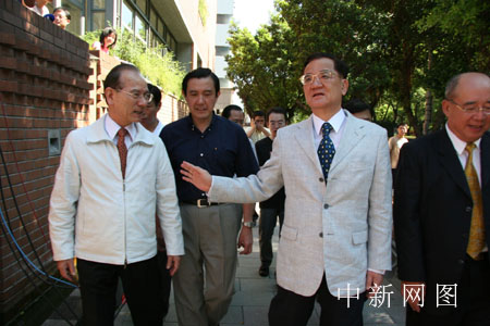 | 7月16日,中國(guó)國(guó)民黨主席選舉在全臺(tái)601個(gè)投票所展開(kāi),F(xiàn)任國(guó)民黨主席在居家附近的臺(tái)北復(fù)興中小學(xué)參加投票。圖為連戰(zhàn)(右二)在步入學(xué)校前,與國(guó)民黨秘書(shū)長(zhǎng)林豐正(左一)交談臺(tái)灣農(nóng)產(chǎn)品登陸問(wèn)題,1號(hào)參選人、臺(tái)北市長(zhǎng)馬英九(中)和國(guó)民黨副主席吳伯雄(右一)陪同。中新社記者 董會(huì)峰
