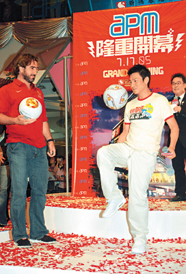 昨日觀塘apm商場(chǎng)隆重開幕,華仔、坎通納、新鴻基地產(chǎn)發(fā)展有限公司副主席兼董事總經(jīng)理郭炳聯(lián),與香港旅游發(fā)展局主席周梁淑怡議員出席典禮,并主持鳴炮儀式。fans聞風(fēng)而至,超過(guò)三千市民逼爆商場(chǎng),司儀首先介紹坎通納出場(chǎng),fans立即歡呼,然后介紹華仔出場(chǎng)時(shí),聲勢(shì)遠(yuǎn)勝坎通納。